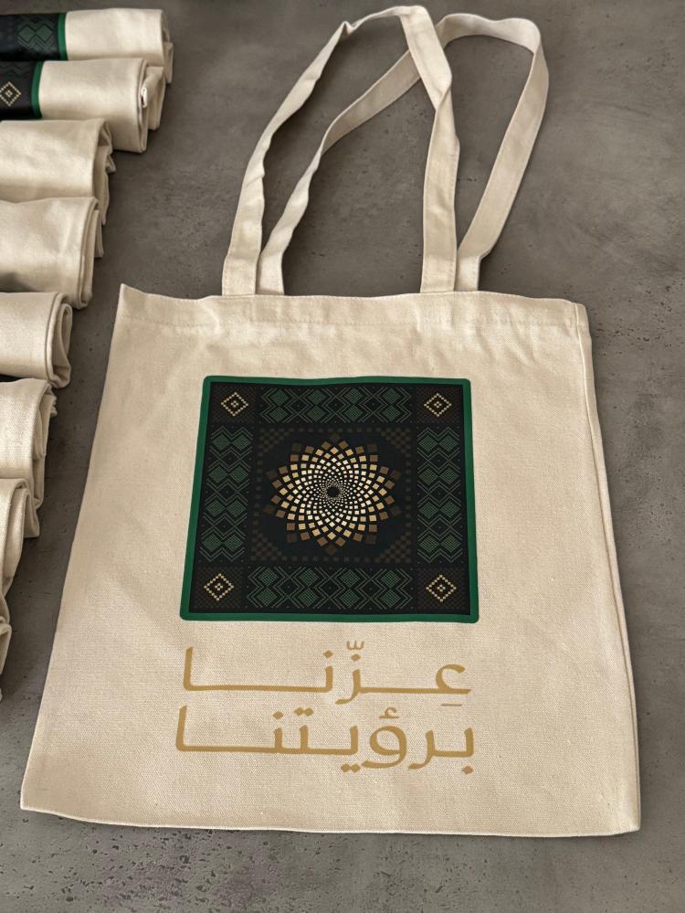 ٣٠شنطة توت باك تحمل تفاصيل شعارات اليوم الوطني مع اضافه عبارك عزنا برؤيتنا ، وتنسيقها بتاق عزنا بطبعنا